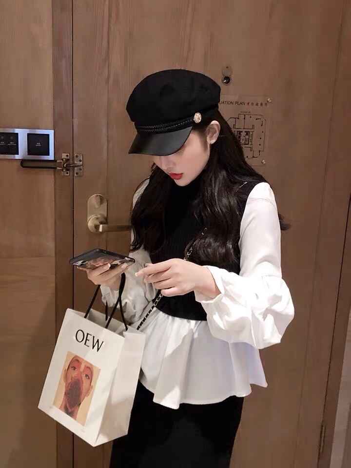 ふんわりボリュームスリーブがクラシカルなブラウスと、ノースリーブニットのレイヤードトップス。