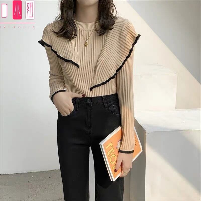 肩からウエストにかけて大胆にフリルがあしらわれたニットです。
