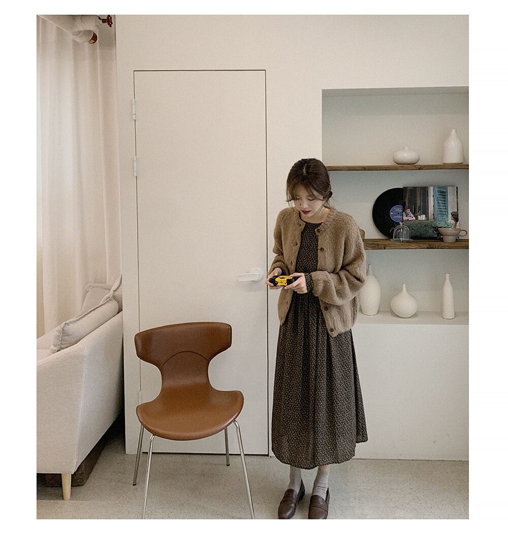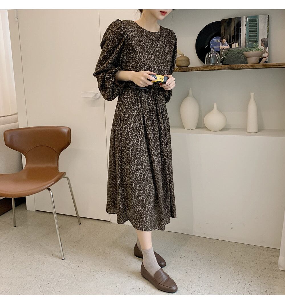 シックな色ベースに、一面の小花柄プリントが華やか。詰まりぎみのネックライン、やわらかな袖など、クラシカルなディテールで美人度がアップするデザインです。