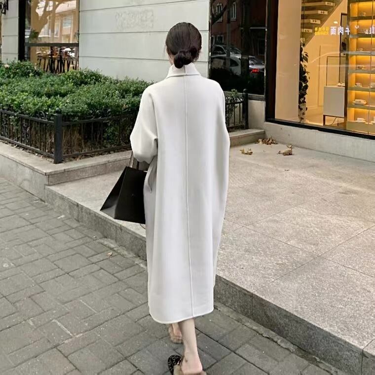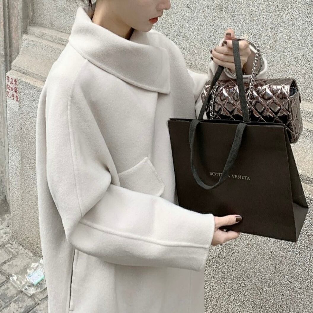 アクセントのハイネックの襟と、すとんと落ちるシルエットが大人かわいいミドル丈コート。