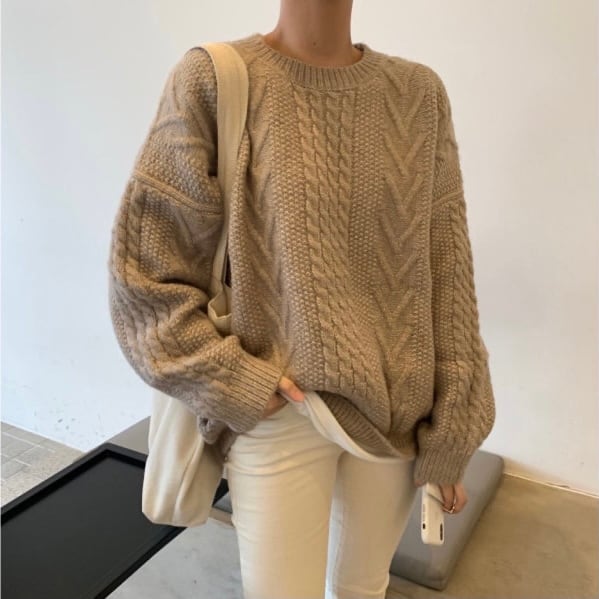 今季流行りのラテカラーのオーバーシルエットのケーブルニット