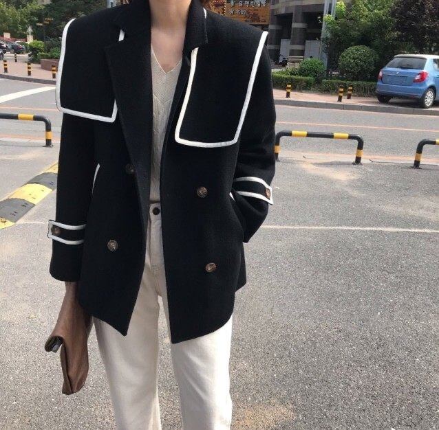 一癖あるデザイン襟と、今季流行のパイピングで施されたシルエットが大人かわいいジャケット。