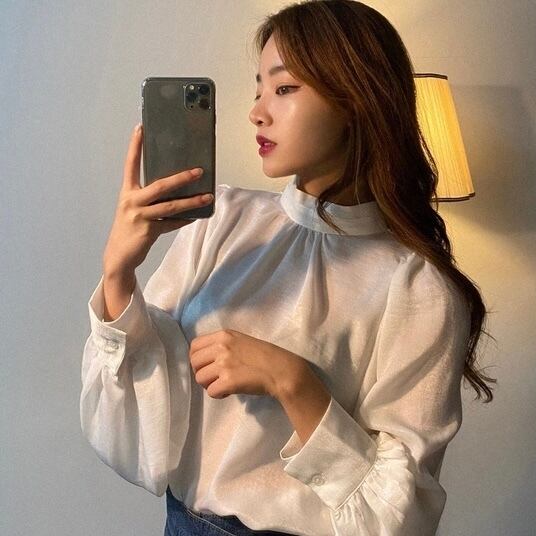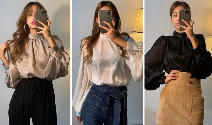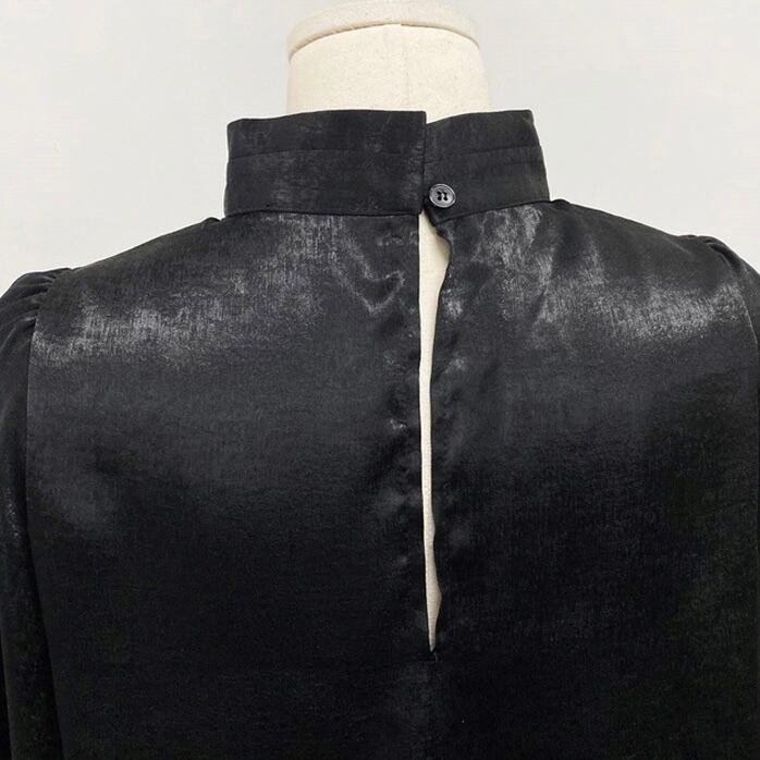 光沢感のあるラグジュアリーな生地に、ランタンスリーブがお洒落なサテンブラウス。