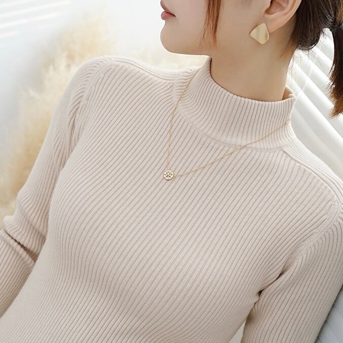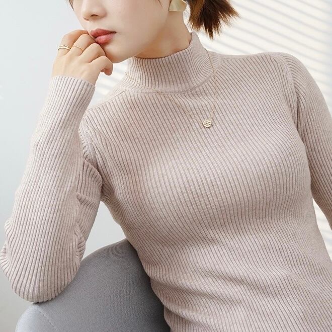 体に沿うシルエットで細見え効果を高めてくれるリブ編みハイネックニットは、タイト過ぎず着心地抜群です。