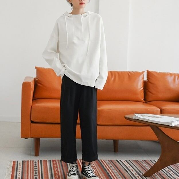 袖とすそはリブなしで、大人っぽい仕上がりに。