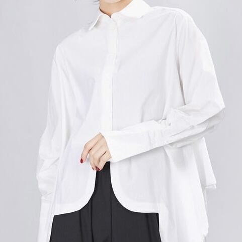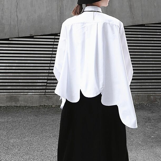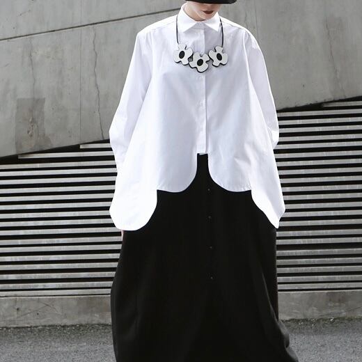 かっちりとした襟元とのギャップの裾のペタルデザインが個性的でお洒落なブラウス。