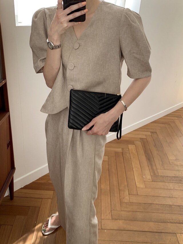 パフスリーブで可愛さを出しつつ上品なカラーで大人可愛いを演出。シャープさが際立つノーカラージャケット。