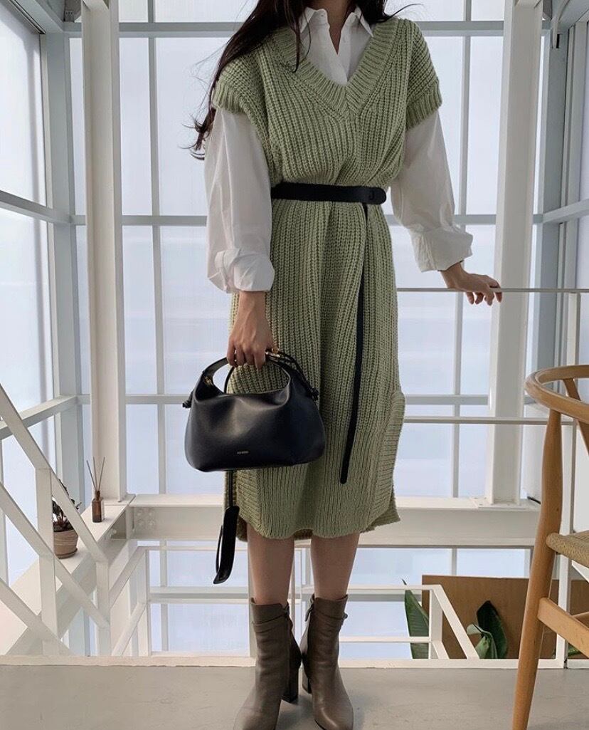 鮮やかなグリーンのニットベストはサイドのスリットがポイント。ゆったりなサイズ感でコーデに取り入れることによりトレンド感をプラス。