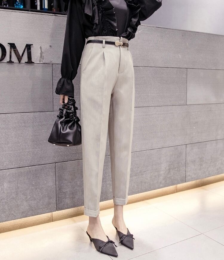 ハイウエストでベルト付きの、まっすぐラインのスリムパンツです。