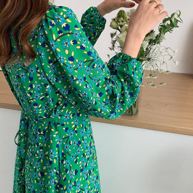 春らしいグリーンのどこかレトロな小花柄ワンピースです。