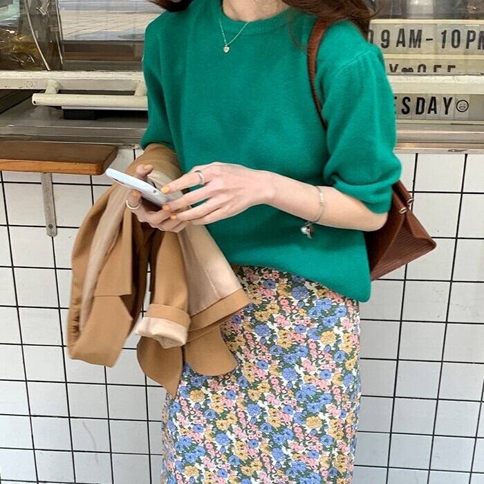 ボトムスは春っぽく小花柄のスカートや、フレアスカートなどがおすすめ。