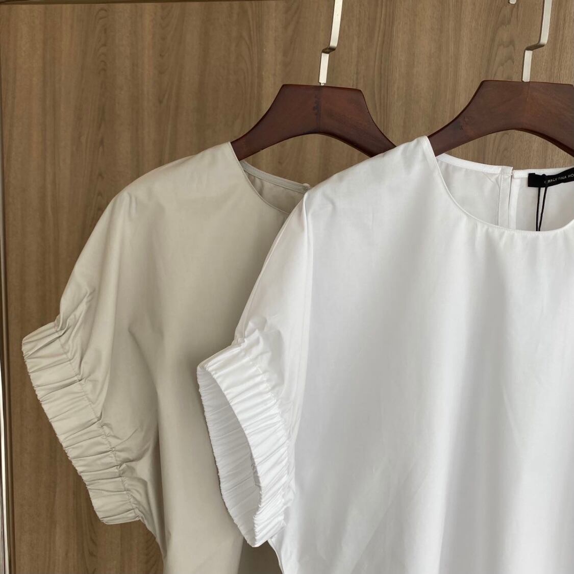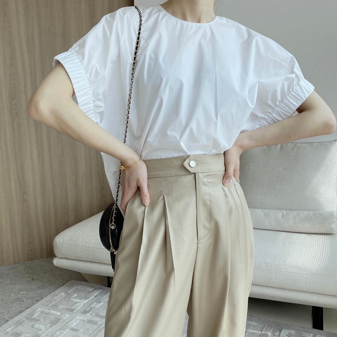ラウンドネックのシンプルな肩落ちシャツに、袖周りはゆったり幅ですがギャザーでメリハリをつけた、こなれ感あるデザイン。