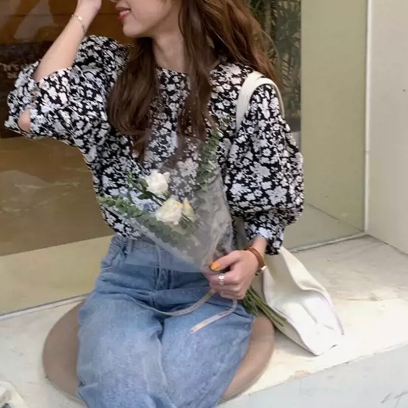 黒地にあしらわれた白い小花柄が繊細なディテールのトップス。