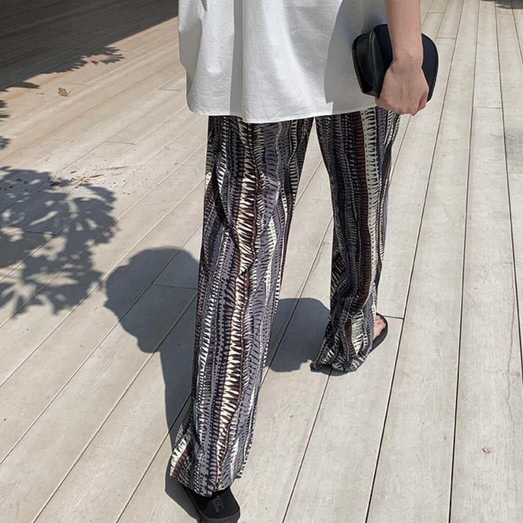 鮮やかな柄が目を引くニュアンス柄のワイドパンツはウエストのリボンゴムがアクセントに。