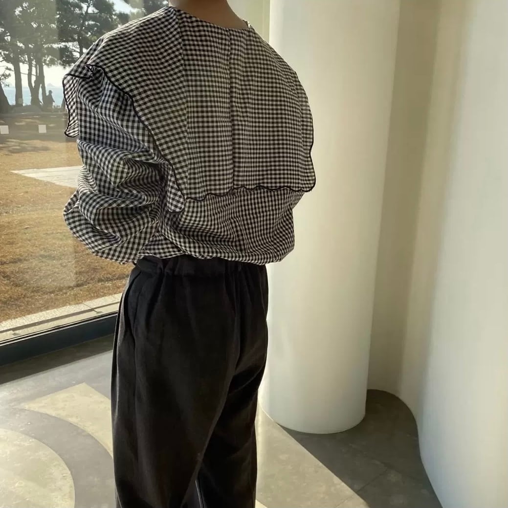 今期注目のビッグ襟ブラウスです。裾に向かって広がるAラインシルエットなのでアウトデモインでも着用可能。