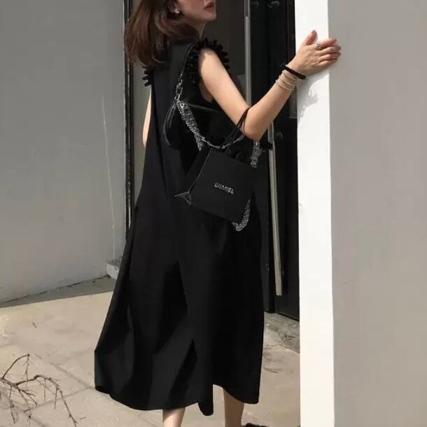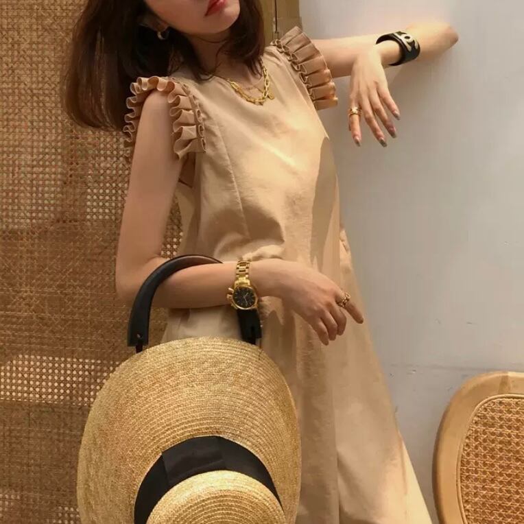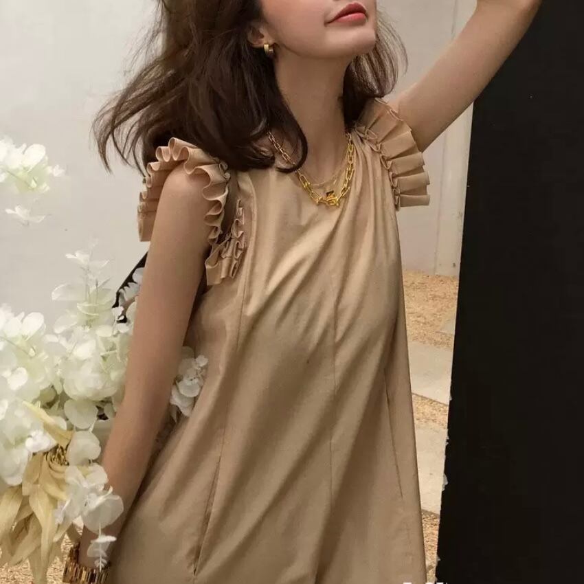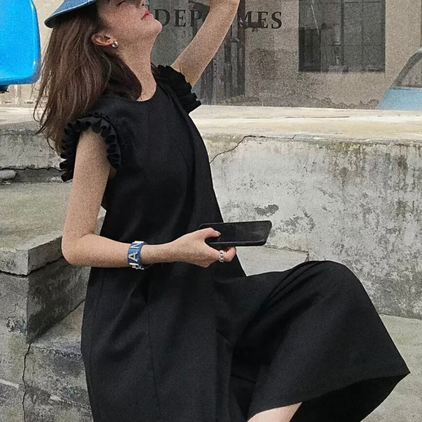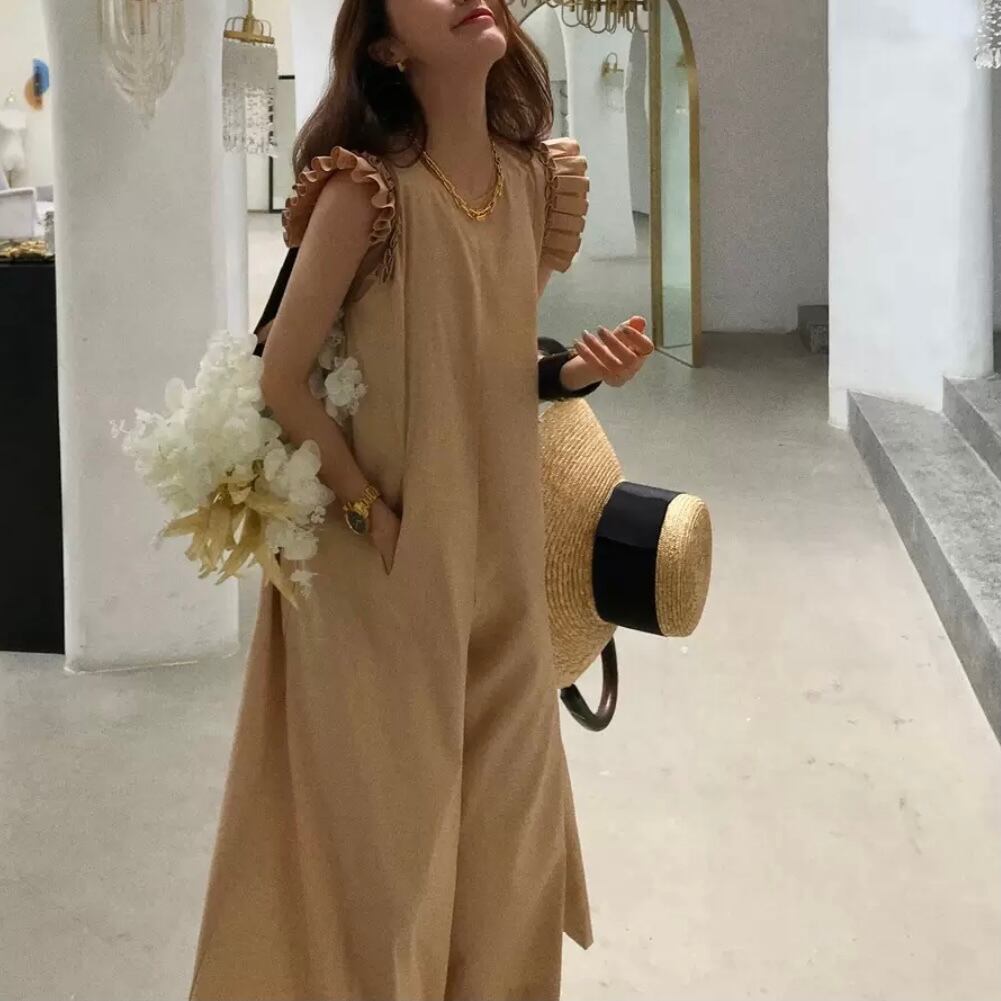 裾に向かってふわりと広がるワイドパンツになったオーツインワンです