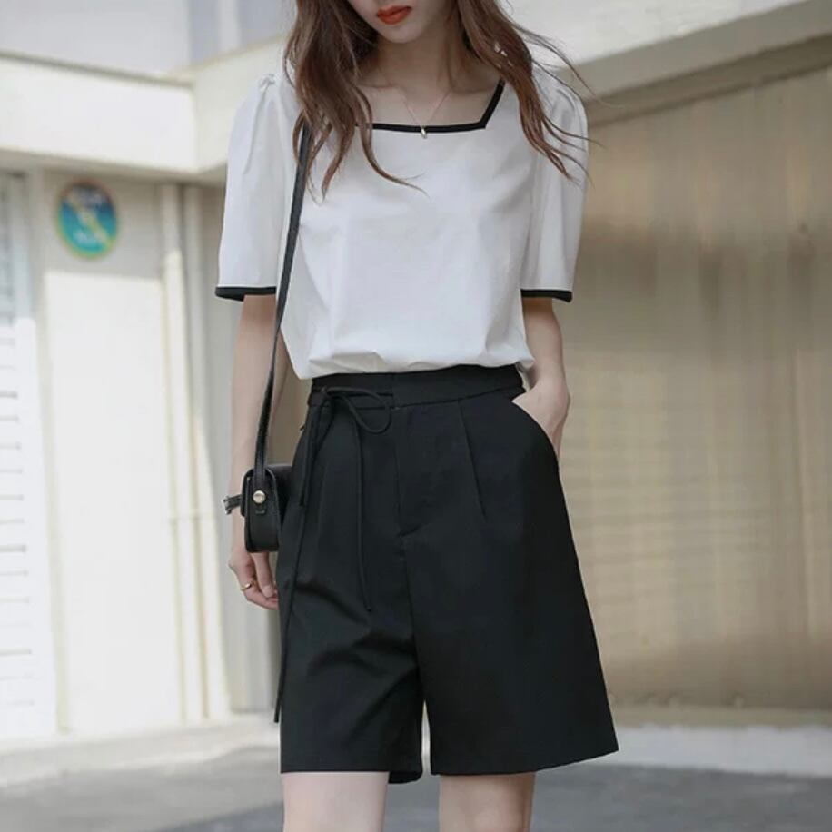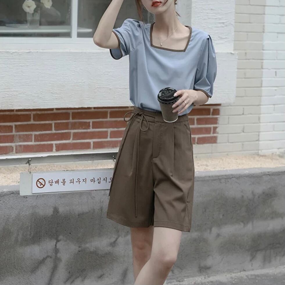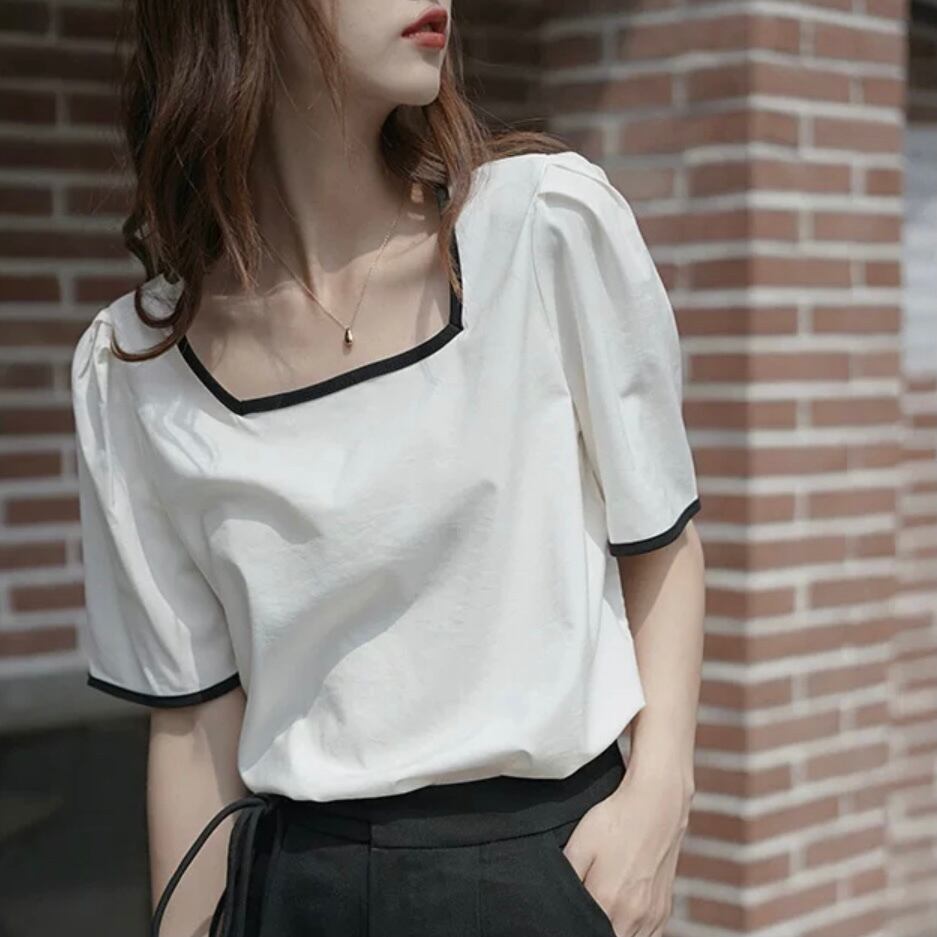 パイピングデザインが可愛らしい、スクエアネックのトップスです。