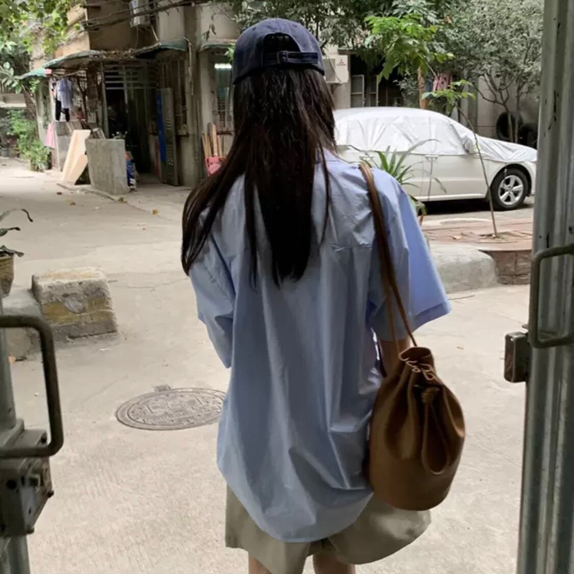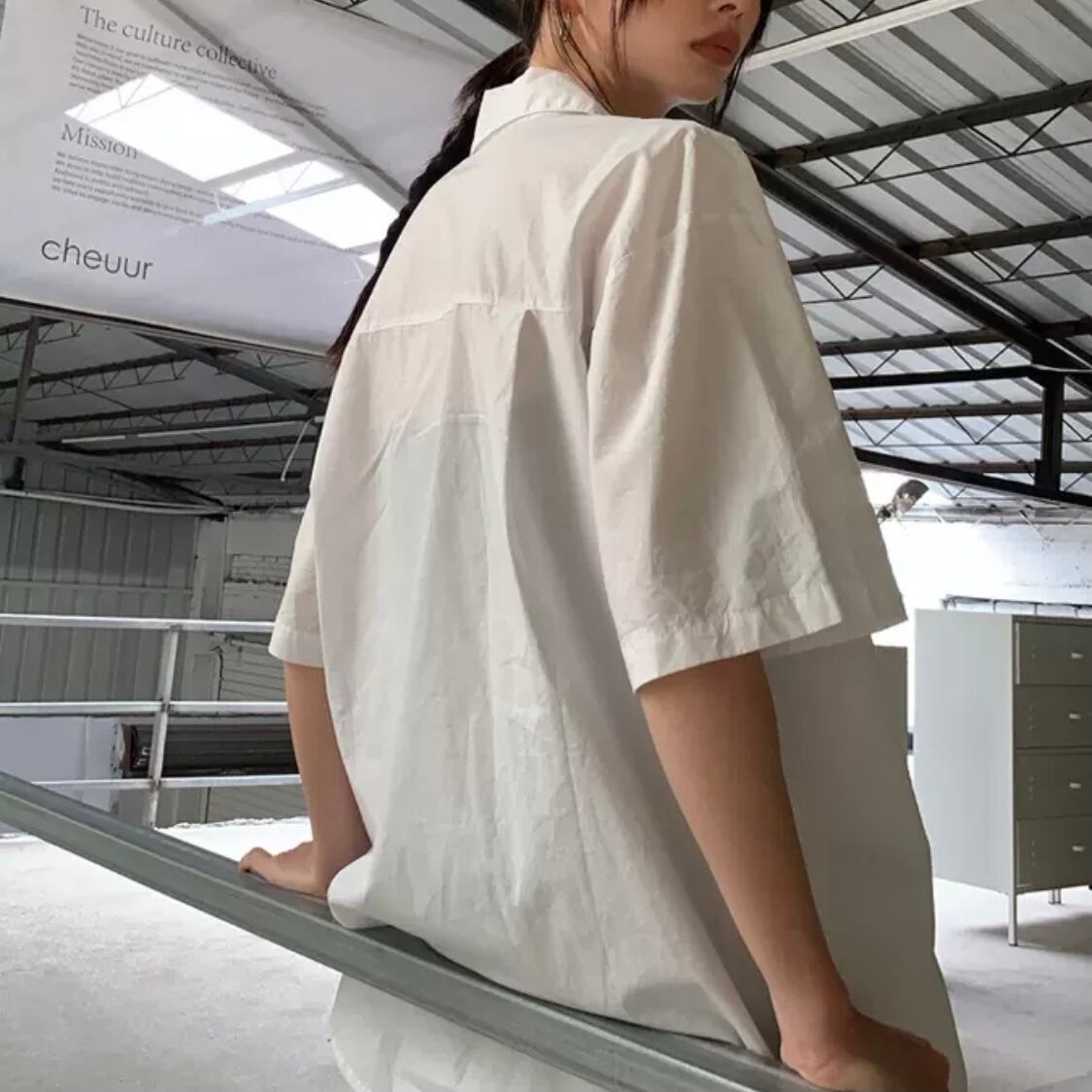 抜け感のあるオーバーシャツのショルダーに変形デザインの襟がアクセントに◎
