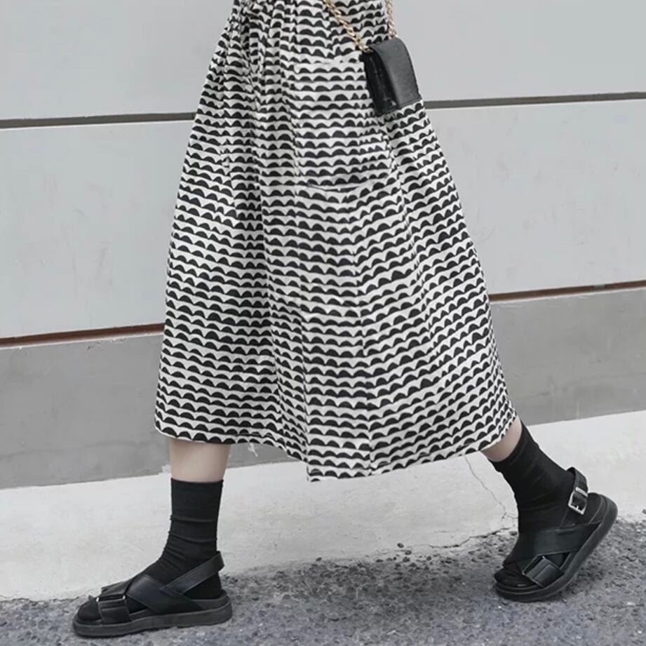 ウエスト周りはすっきりと、裾にかけてパターンフレアシルエットに。