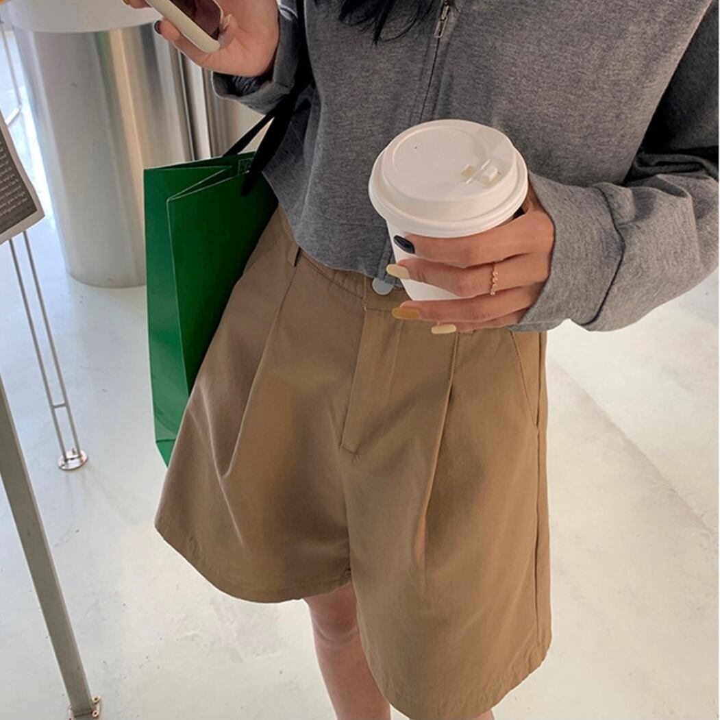 ハイウエストですっきとしたお腹周りとタック入りで、裾フレアで足がほっそり見えるシルエットが嬉しいハーフパンツ。