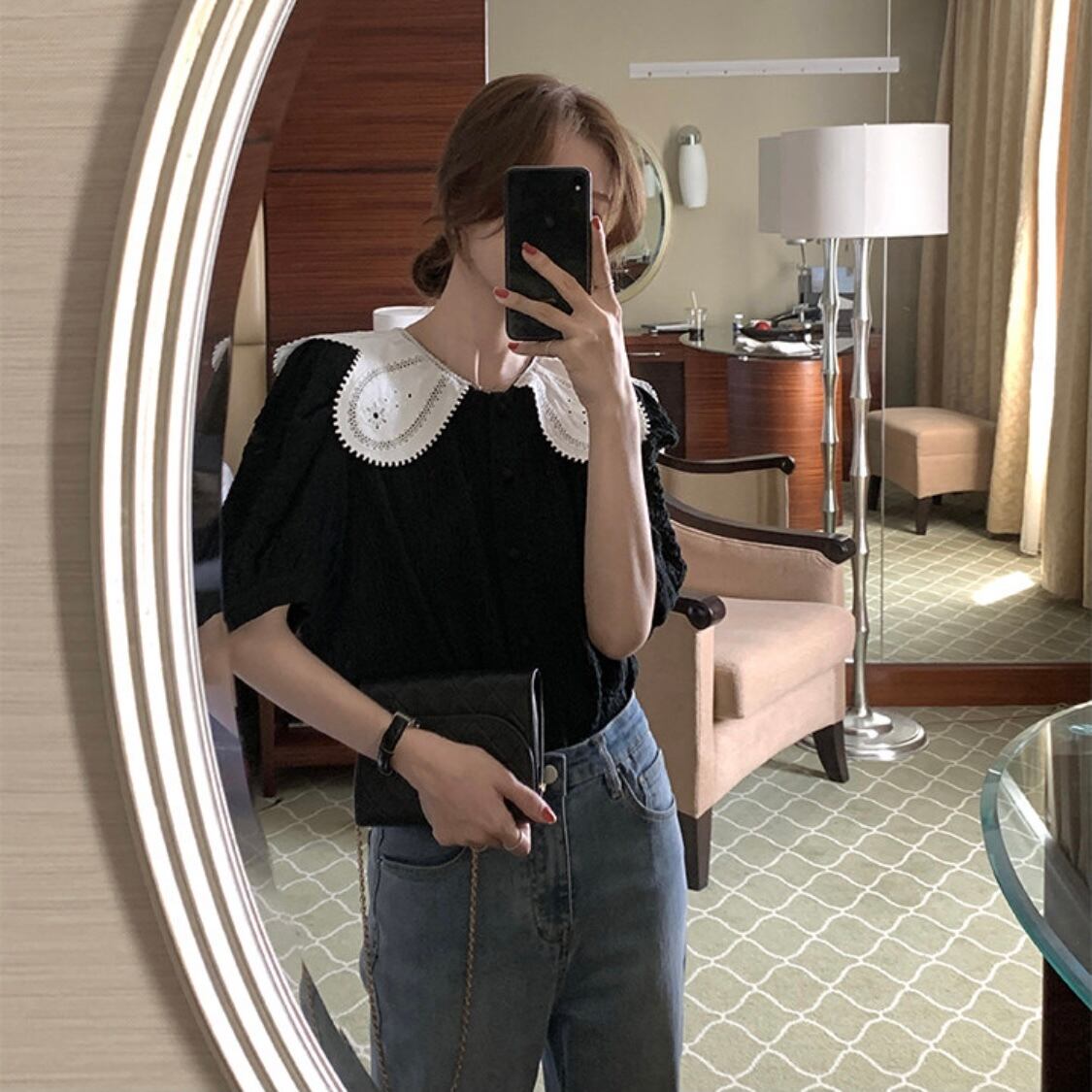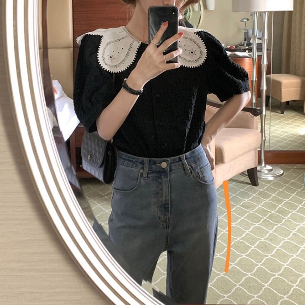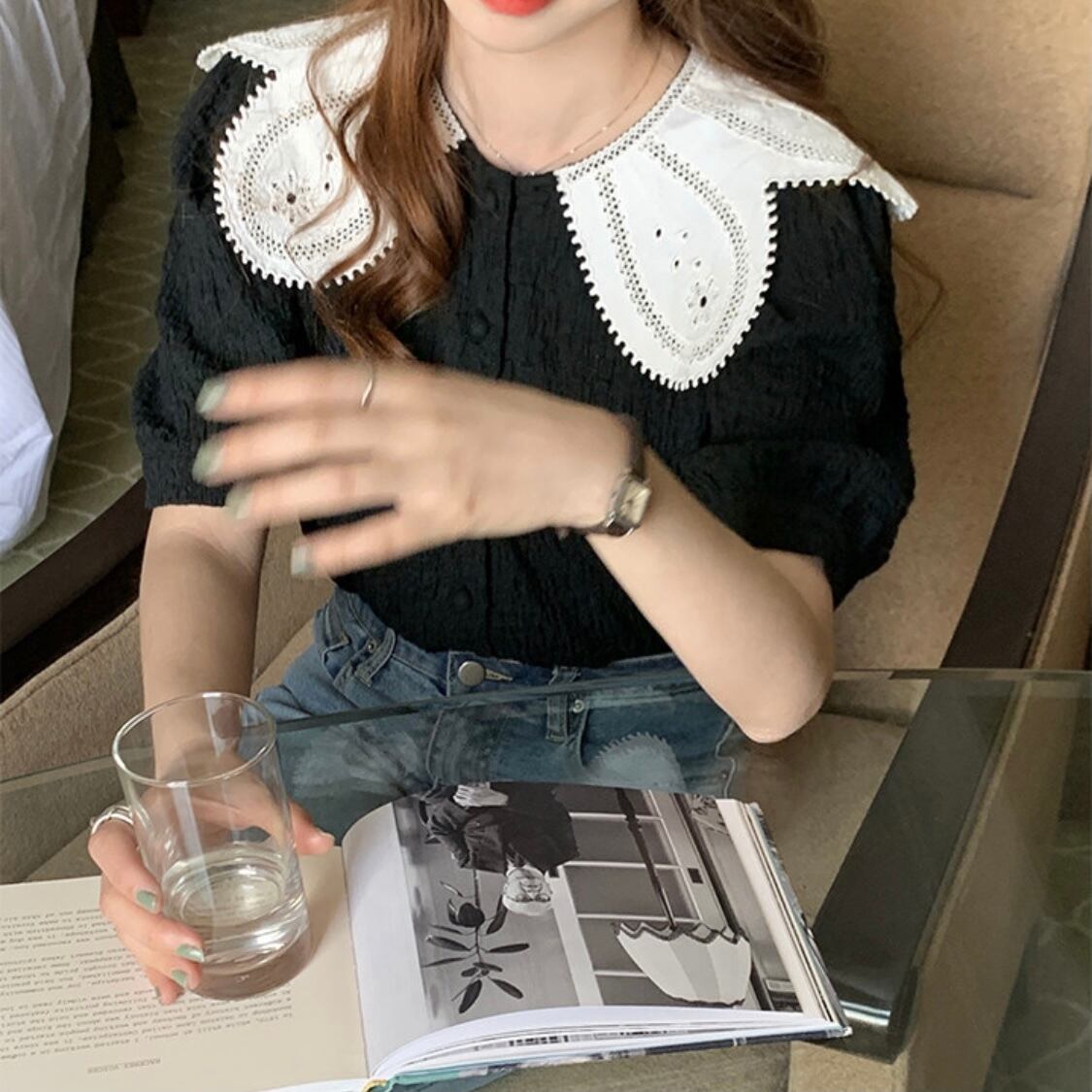 ハーフスリーブでさらに女の子っぽさをアップ。前ボタンはすべて外すことができるので着脱がしやすく、パンツ合わせの甘辛バランスを意識したスタイルもおしゃれにキマります。