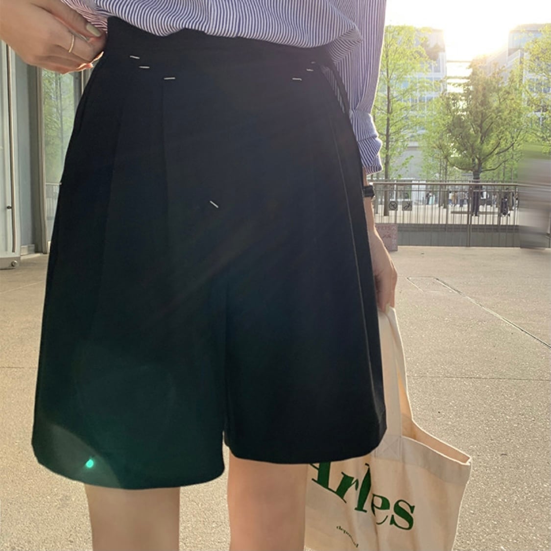 脚のラインを拾いにくいドレープがきれいなハーフパンツ。