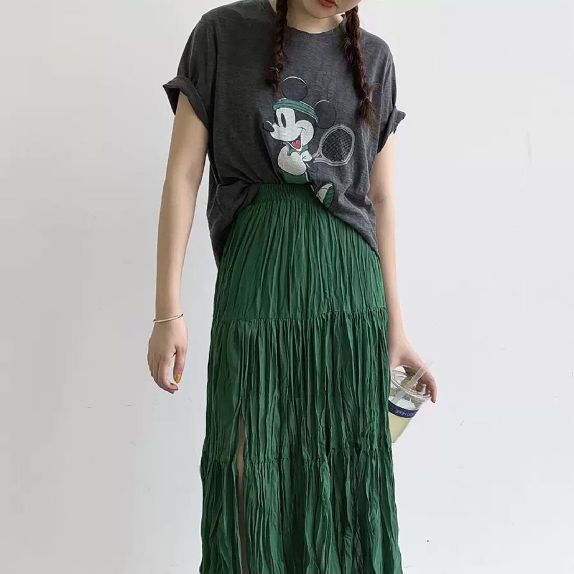 トーンが暗めでも、軽やかな素材感で夏っぽく、涼し気にコーデが仕上がります。