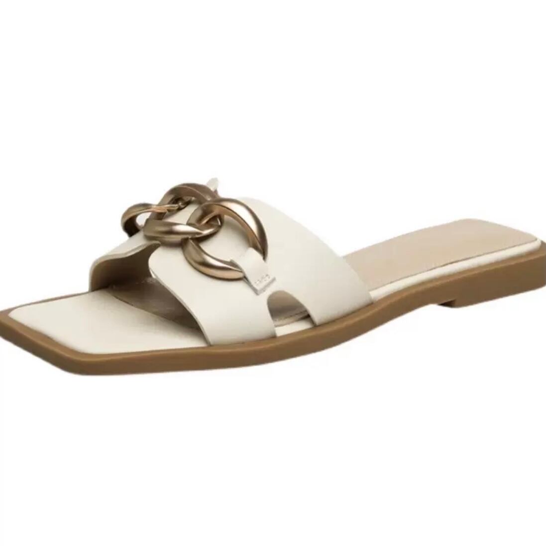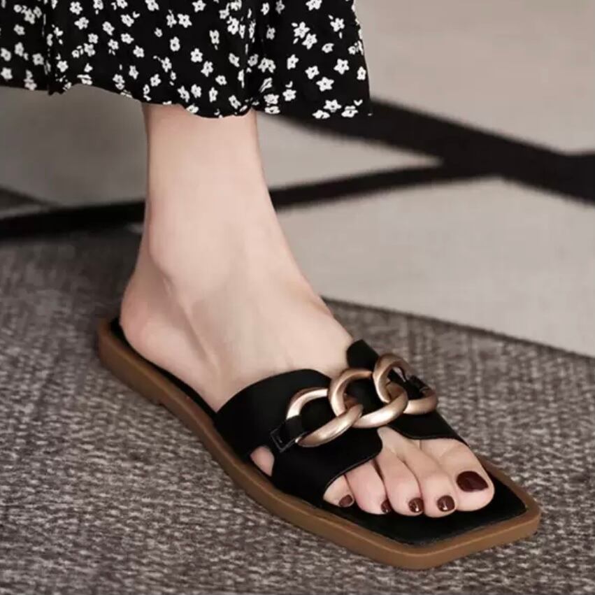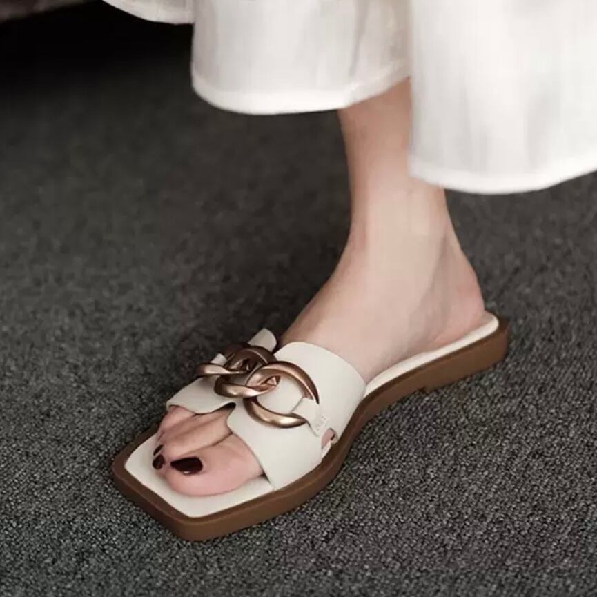 フラットなスリッパタイプながら、バックル付きでトレンド感のあるスクエアトゥがコーデをグッと大人っぽく格上げしてくれます。