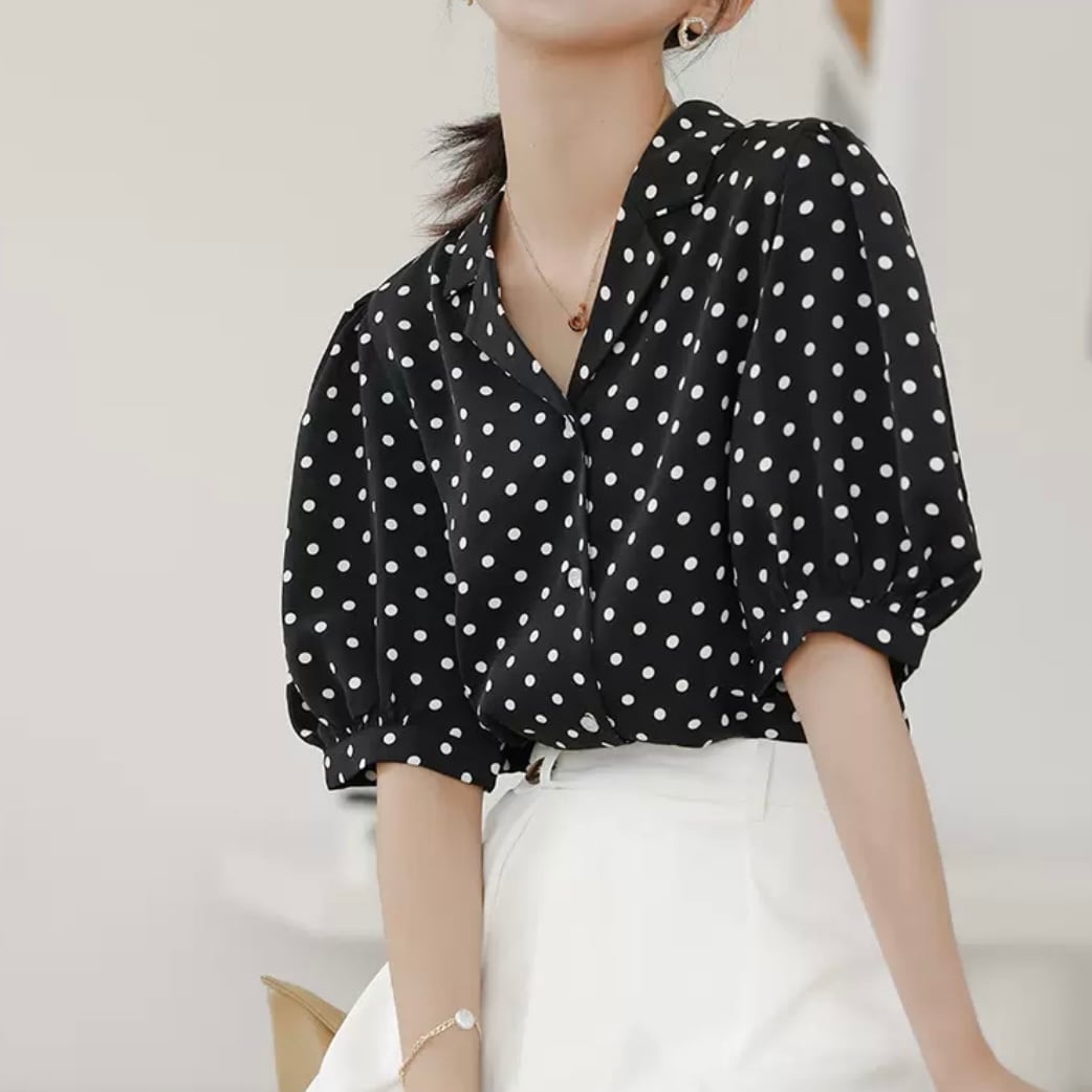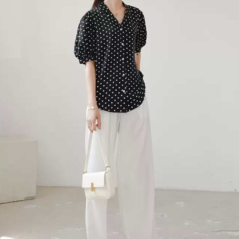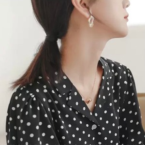 オープンカラーの首元とドットの組み合わせが夏っぽく、シフォン素材の体に沿うシルエットが女性らしいアイテムです。