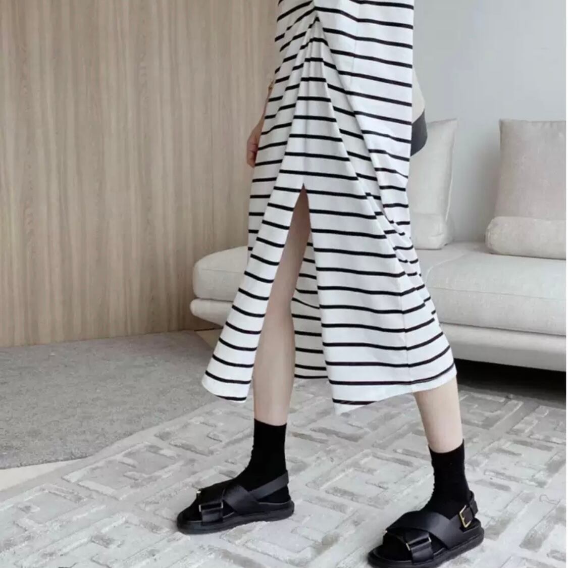 カジュアルなボーダーに、ウエストマークのツイストデザインや、ダボつきがちで足さばきの悪さをスリットでカバーしたロンTアイテムです。