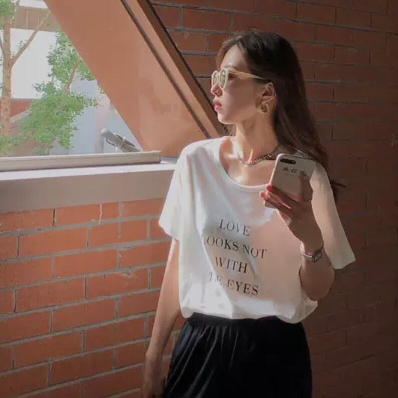 ルーズなシルエットにロゴのプリントされたTシャツ。