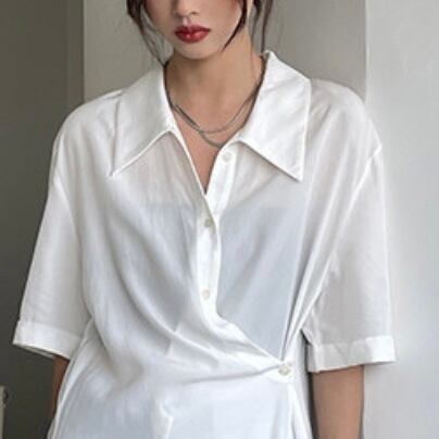 ホワイトとシャツデザインでシンプルながら、裾はカシュクールデザインとさりげないスリットが目を惹くワンピース。