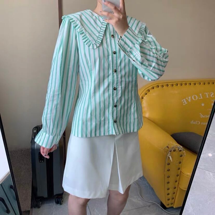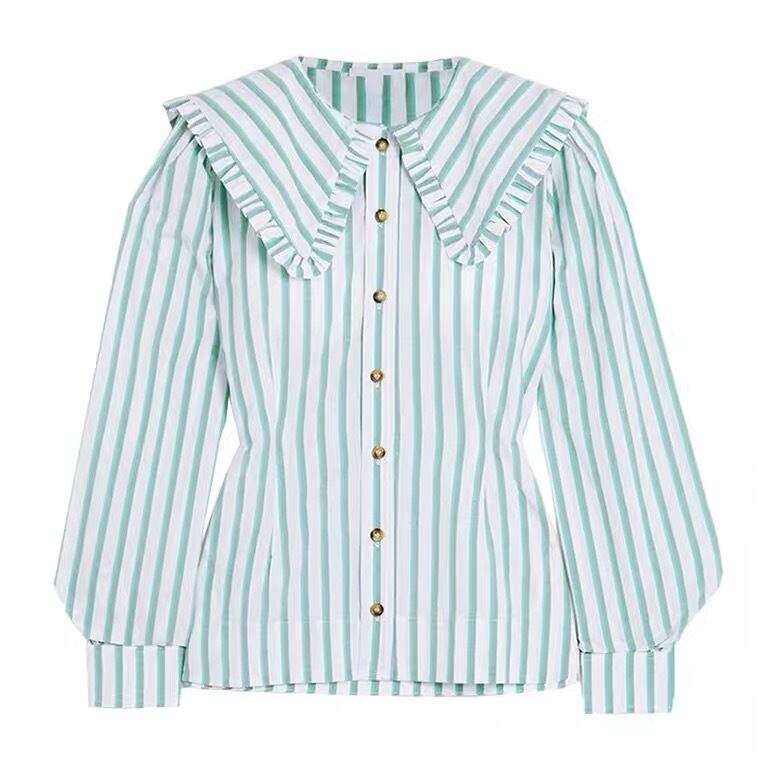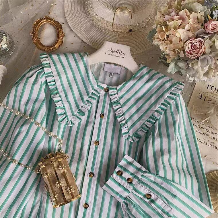 レースをあしらったビッグカラーデザインと、グリーンのストライプが印象的。