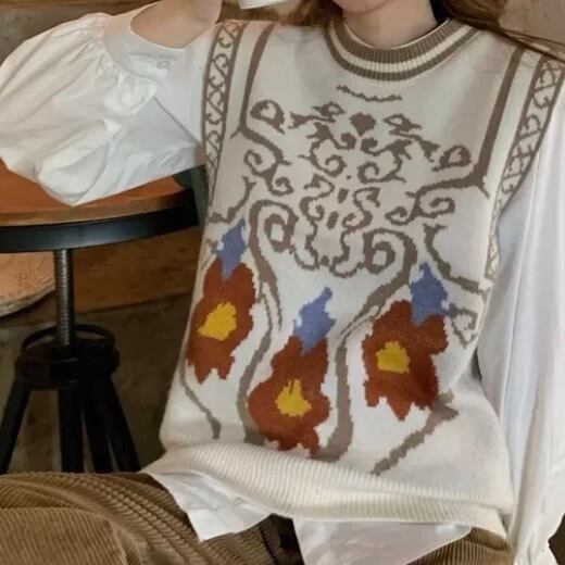 ブラウスのパフスリーブデザインやニットのレトロカラーデザインで女性らしく着られます。
