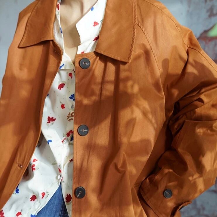 ボリュームのある袖やこっくりとしたオレンジカラー、ボタンを閉めても明けても様になる細部にまで拘った一枚。