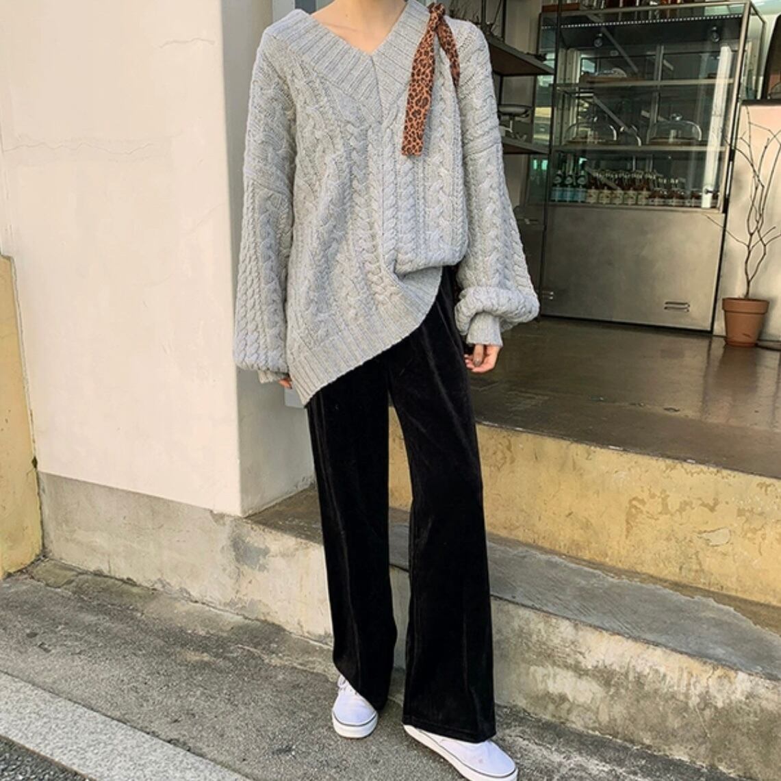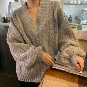 デコルテラインがすっきりと見えるVネック仕様がポイントのゆったり着れるオーバーニット。