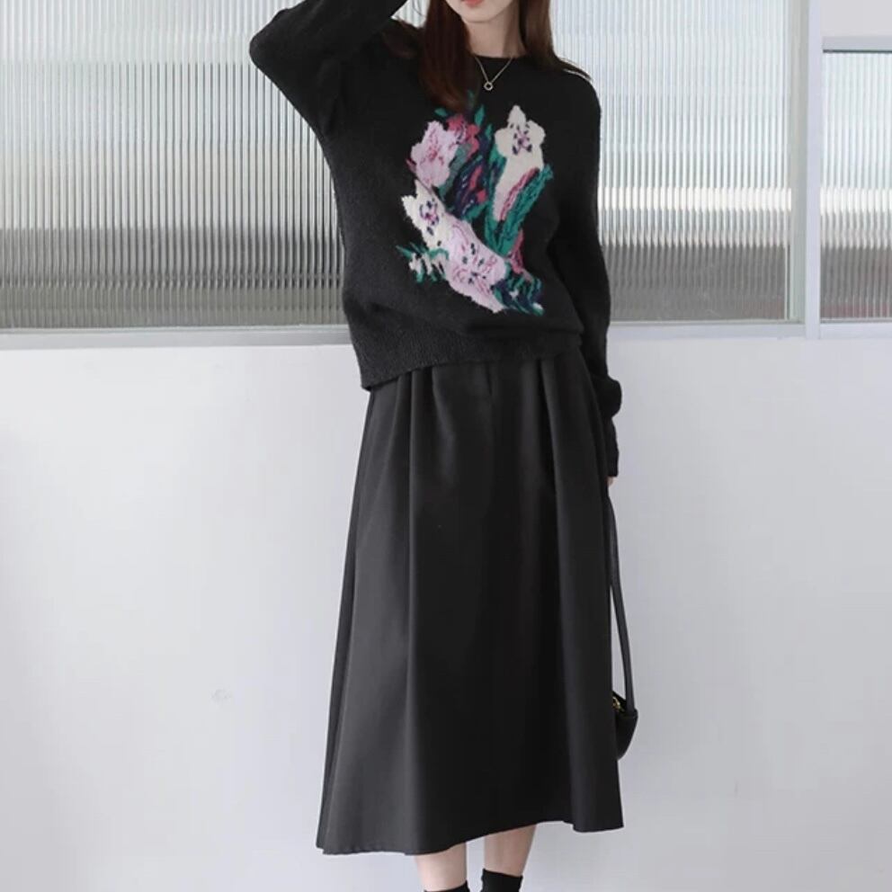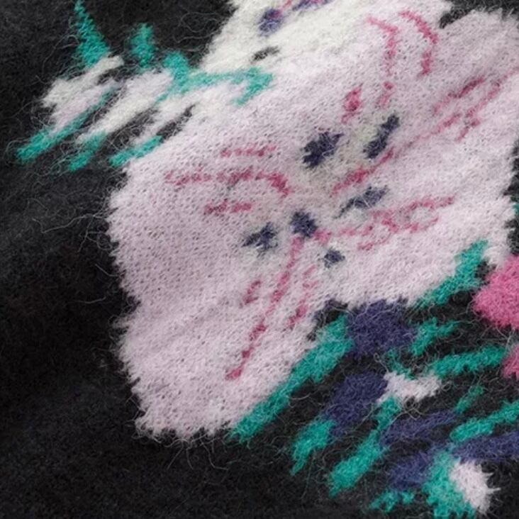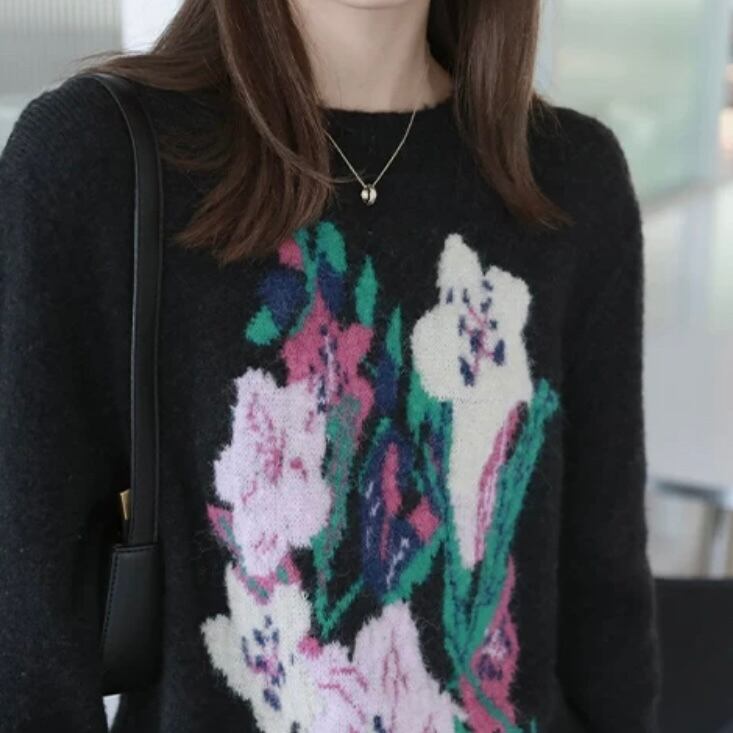まるでキャンバスに描いたようなレトロなフラワー柄が魅力のハイゲージニットトップス。
