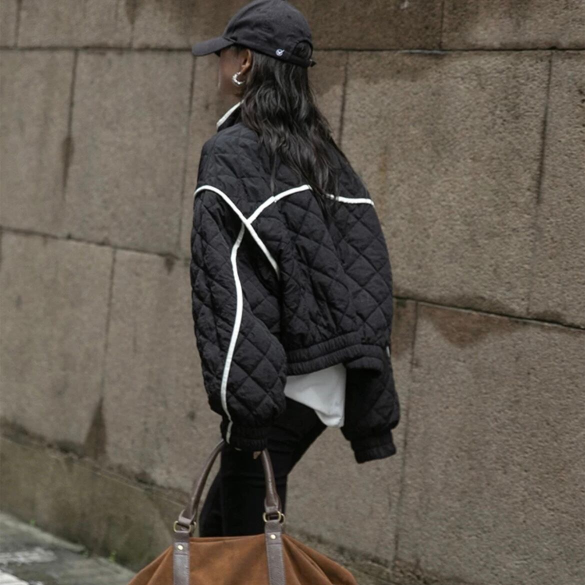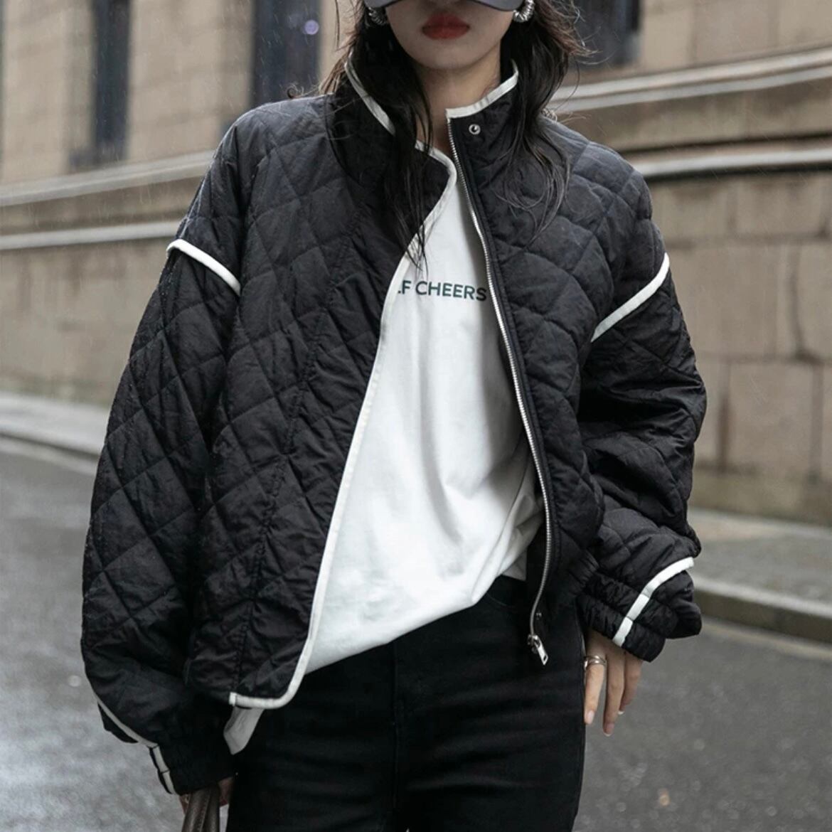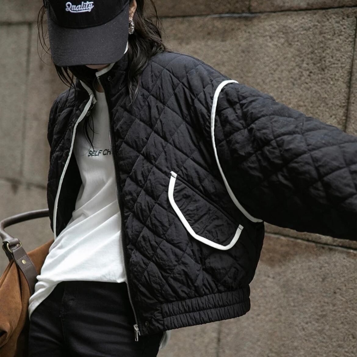 スポーティーなパイピングが目を引くデザインでお洒落さはもちろん、キルティングアイテムの醍醐味である、あったかさも十分に兼ね備えた一着です。