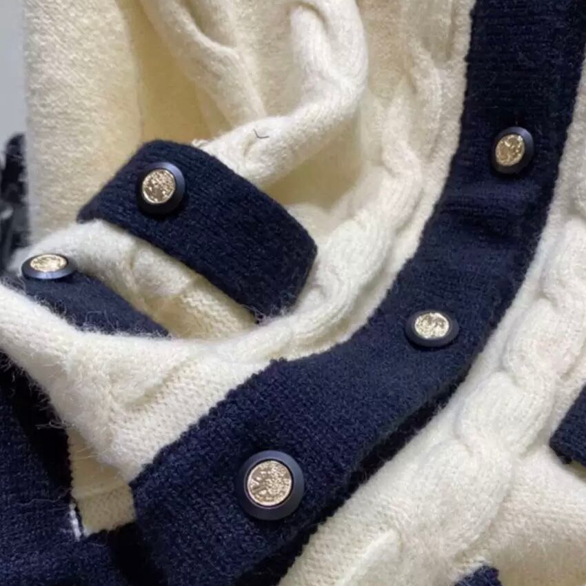 ケーブルニットの凹凸感とバイカラーのフレームカラー、ジャケットのようなボタン。