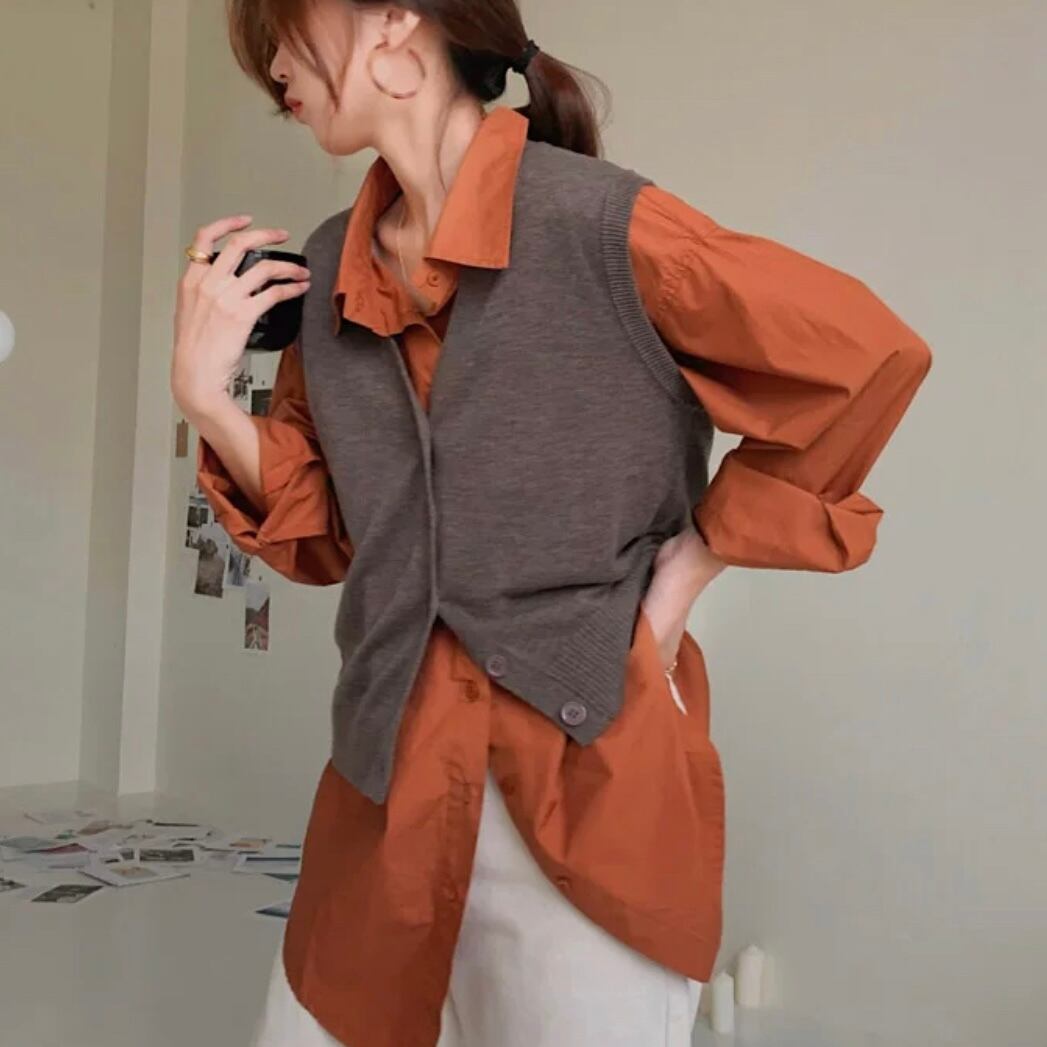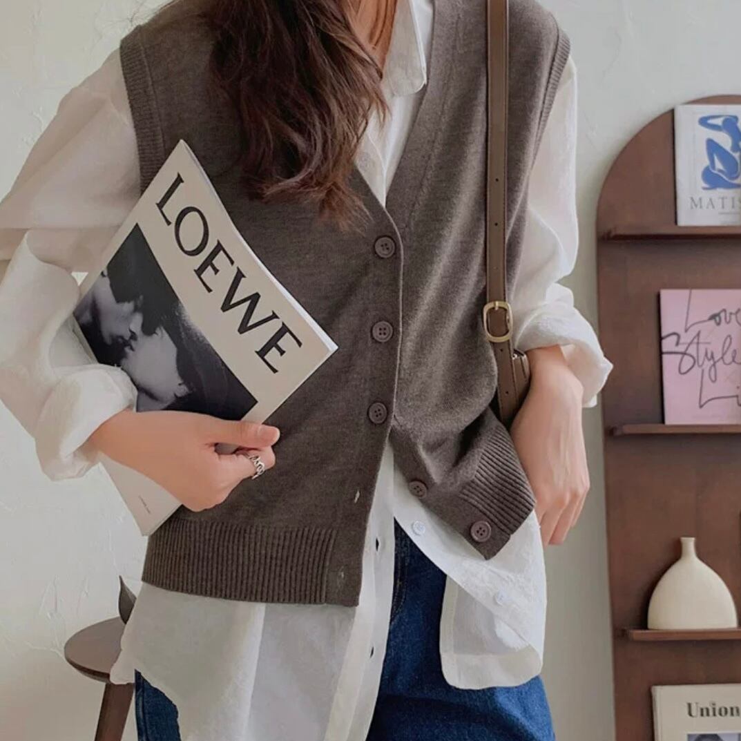 フロントボタンがアクセントになるニットベストはワンピースや手持ちのシャツと相性抜群◎