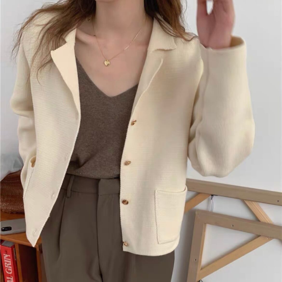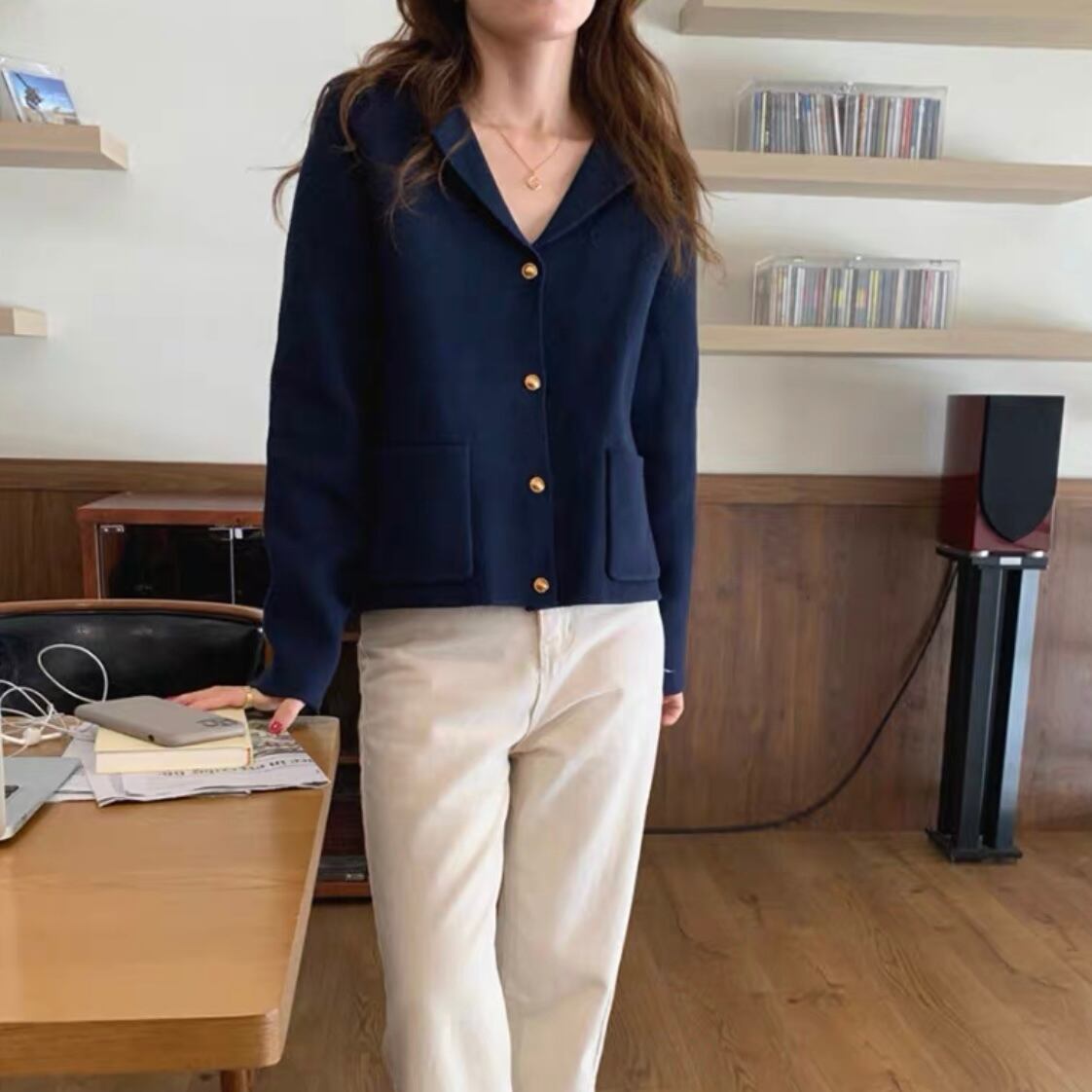こなれ感をプラスする、アクセントの金ボタンとテーラードシルエットがおしゃれを引き立てます