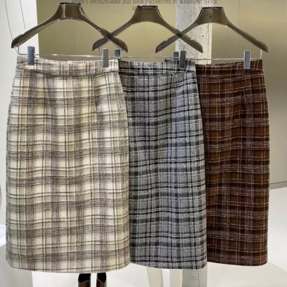 こっくりとしたカラーと大柄のチェックに、タイトなシルエットが大人っぽさを引き上げてくれるポイントになっています。