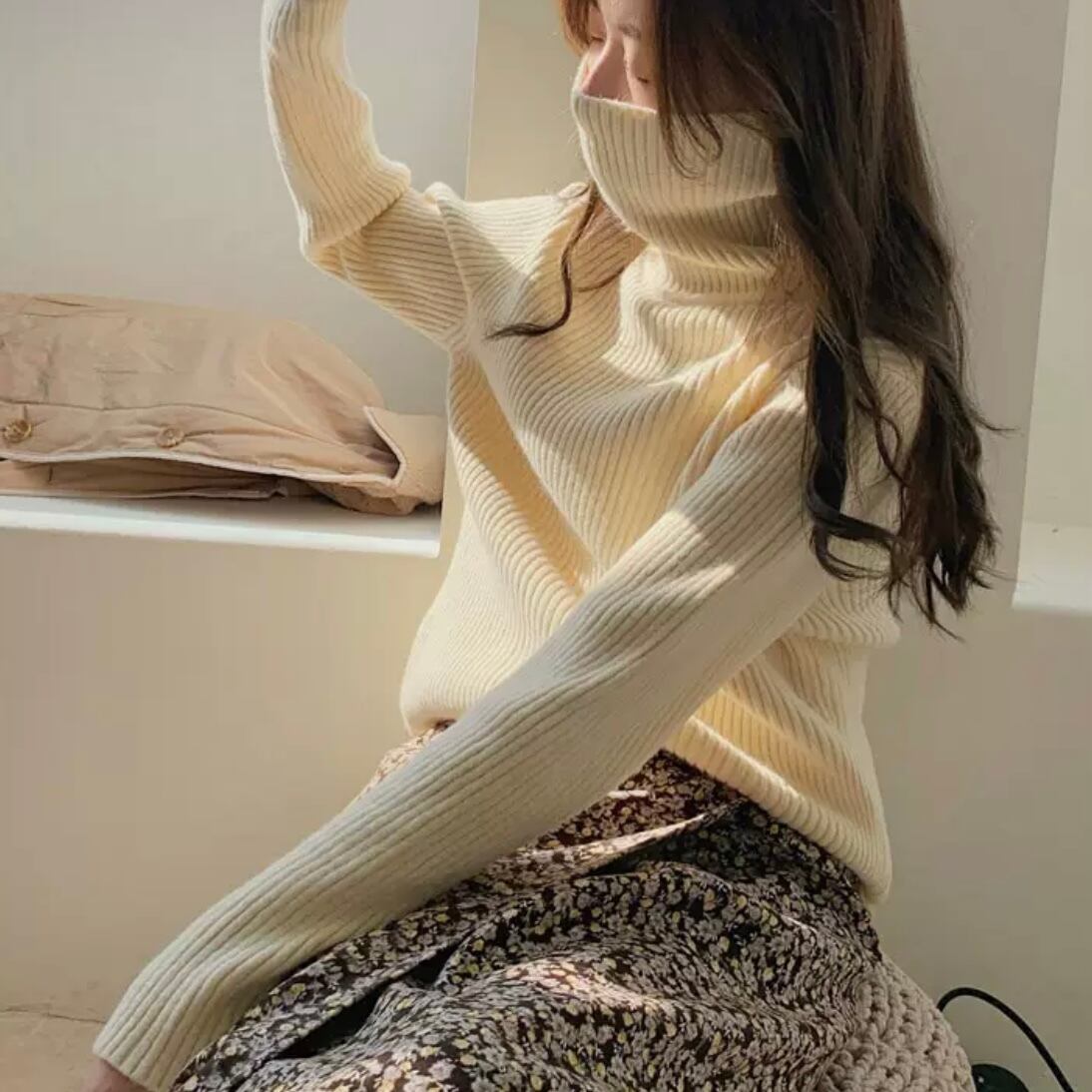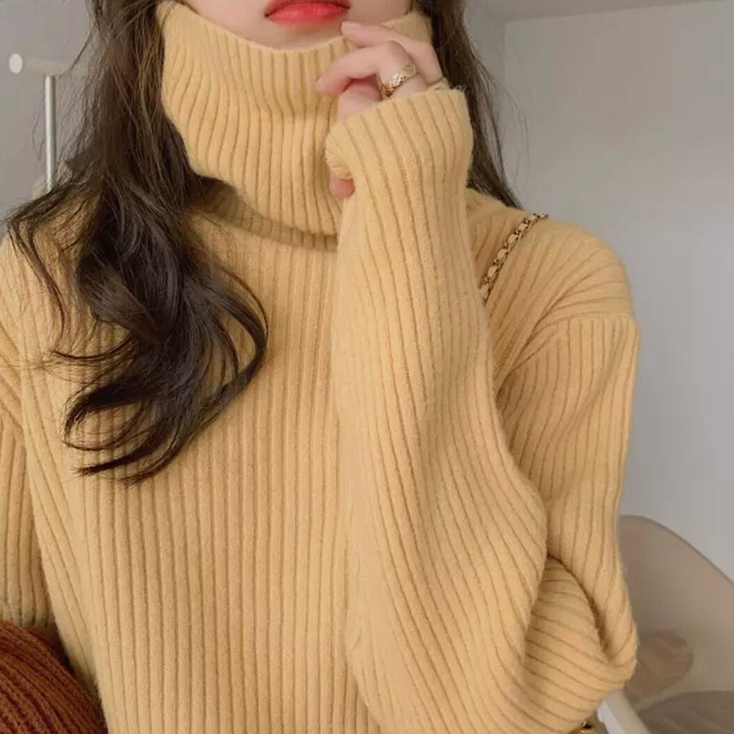 着ぶくれせずに着られるリブ編みのタートルネック。