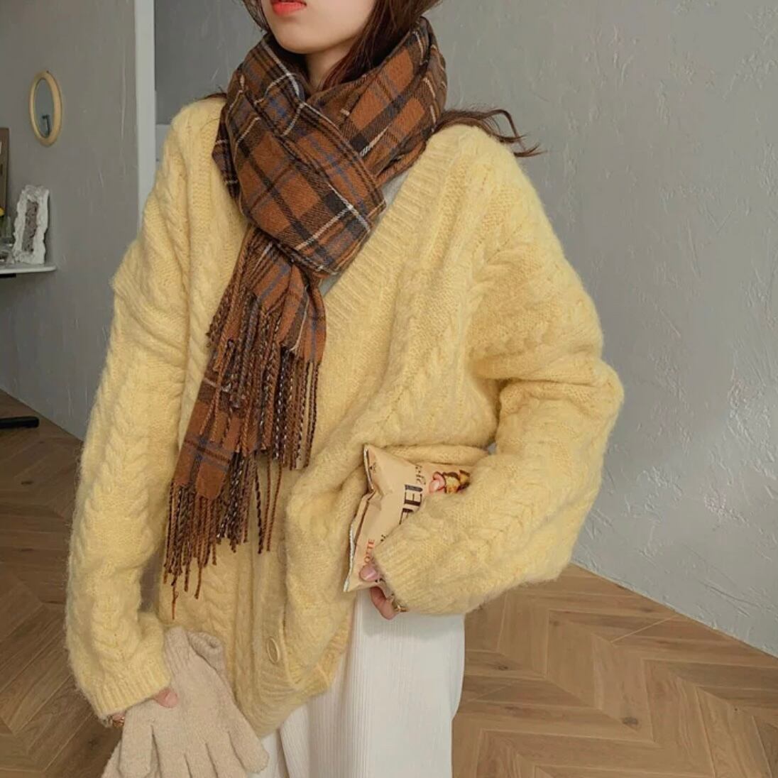 立体感のあるケーブル編みを全体に施したニットカーディガンです。