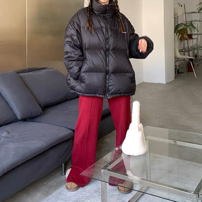 コットン素材のワイドパンツはセンターラインがキレイめな印象に。