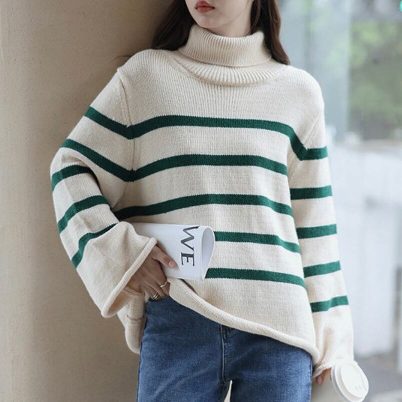 ハイネックデザインとベルスリーブが可愛いボーダーニット。