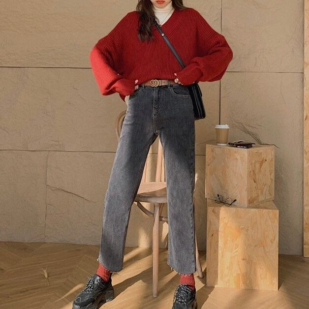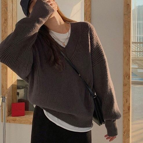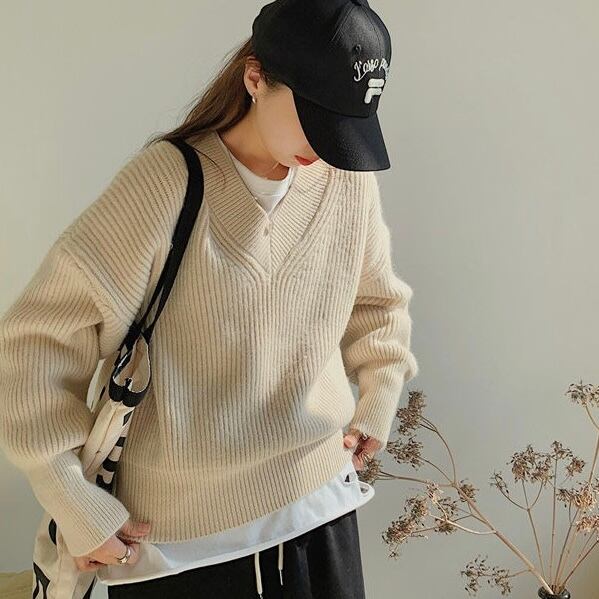 深めのVネックにゆったりしたシルエットなのでカジュアルから綺麗めまでスタイリングを選ばないニット◎