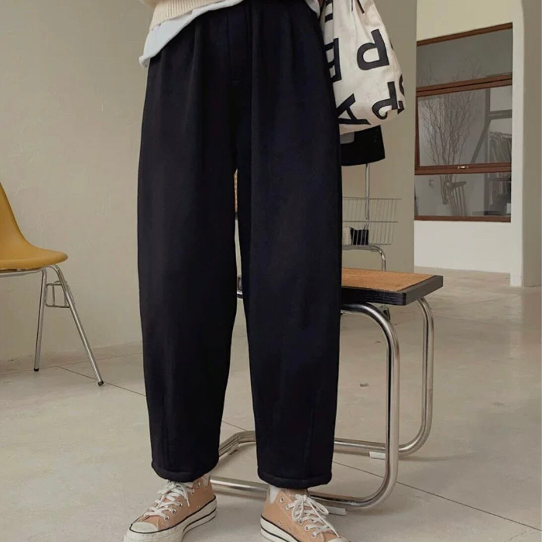裏はボアで暖かく、ゆったり楽ちんながらも上品にもカジュアルに着られる着回し力のあるボトムです。