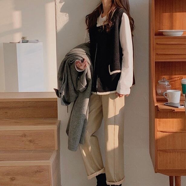 着まわしやすいカラーなのでシャツの上に着たり、アウターのインナーにしたりとコーデの幅が広がります。