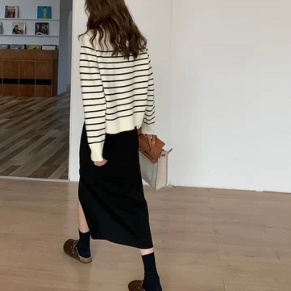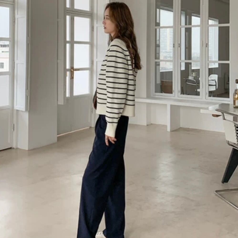メンズライクな中に女性らしい抜け感のあるボーダーヘンリーネックニット。
